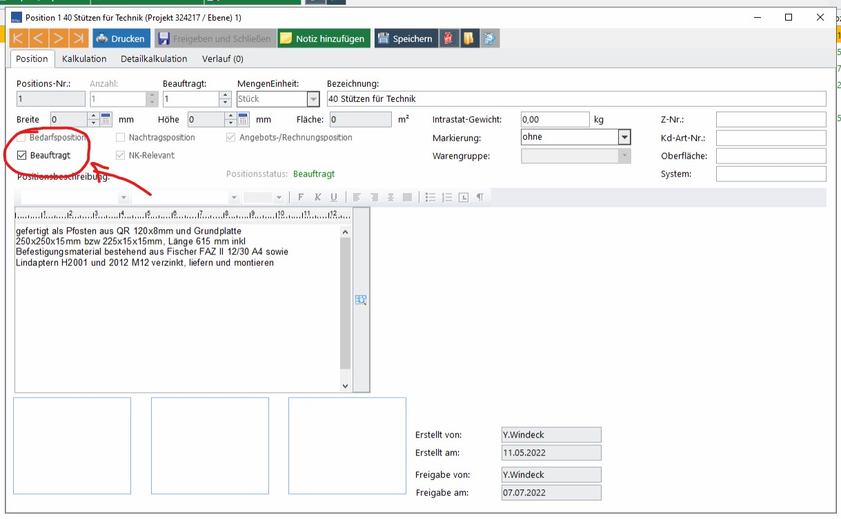 Es kann passieren, dass aus einem Angebot ein Auftrag erzeugt, der Auftrag aber effektiv durch ERPlus nicht erstellt wurde. Dennoch ist das Angebot bzw dessen Positionen gesperrt. Um diese zu entsperren, muss das Angebot wieder freigegeben werden. Danach kann die einzelne Position geöffnet (bearbeitet) werden. Auch wenn das Schloss-Symbol ohne Funktion ist, kann der Haken bei “Beauftragt” entfernt und dann auf "Speichern" geklickt werden. Sind alle Positionen wieder freigegeben, kann aus dem Angebot erneut ein Auftrag erzeugt werden.