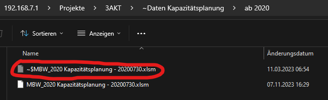 In einigen Situationen wird die Datei nicht ordentlich durch das Office-Programm entfernt (z.B. wenn der Rechner heruntergefahren wird ohne Das Dokument vorher zu schließen). Die Steuerdatei muss dann manuell entfernt werden.