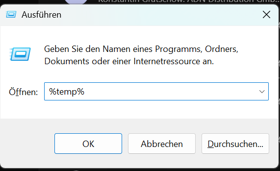 Wenn dies nicht hilft über Ausführen den TEMP Ordner öffnen und den Inhalt löschen