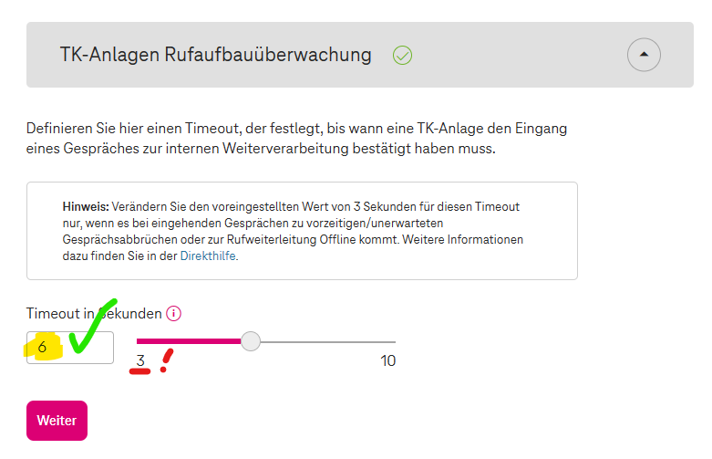Im BSP der Telekom muss die die Überwachung der TK-Anlage vom Default-Wert 3 Sekunden auf zB. 6 Sekunden geändert werden.