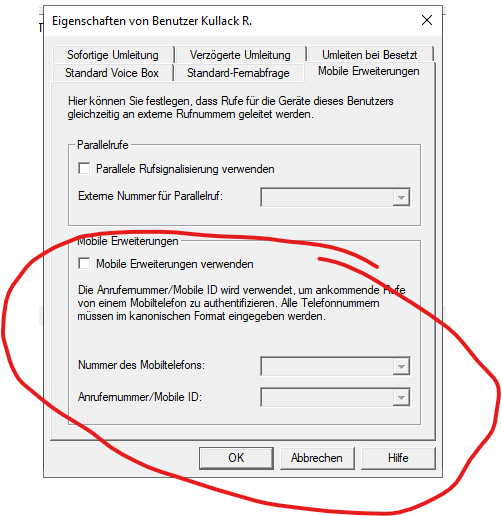 Das Feature versucht Anrufe auf die Festnetznummer und/oder zugeordnete Mobilfunknummer auf allen Geräten zu signalisieren. Da die Rufumleitung auf dieselbe Mobilfunknummer gesetzt ist, entsteht eine Schleife, da die Telefonanlage die Nummer der mobilen Erweiterung anrufen soll, diese aber auf der Festnetznummer signalisiert wird - und weiterleitet.
