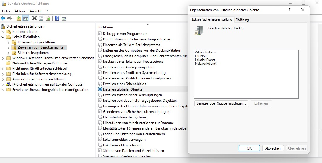 Abhilfe: Lokale Sicherheitsrichtlinie am PC/Laptop > Lokale Richtlinien > Zuweisung von Benutzerrechten > Erstellung globaler Objekte bearbeiten und den Benutzer explizit hinzufügen. (Administratoren / DIENST / Lokaler Dienst sowie Netzwerkdienst sind im Standard bereits aufgeführt)