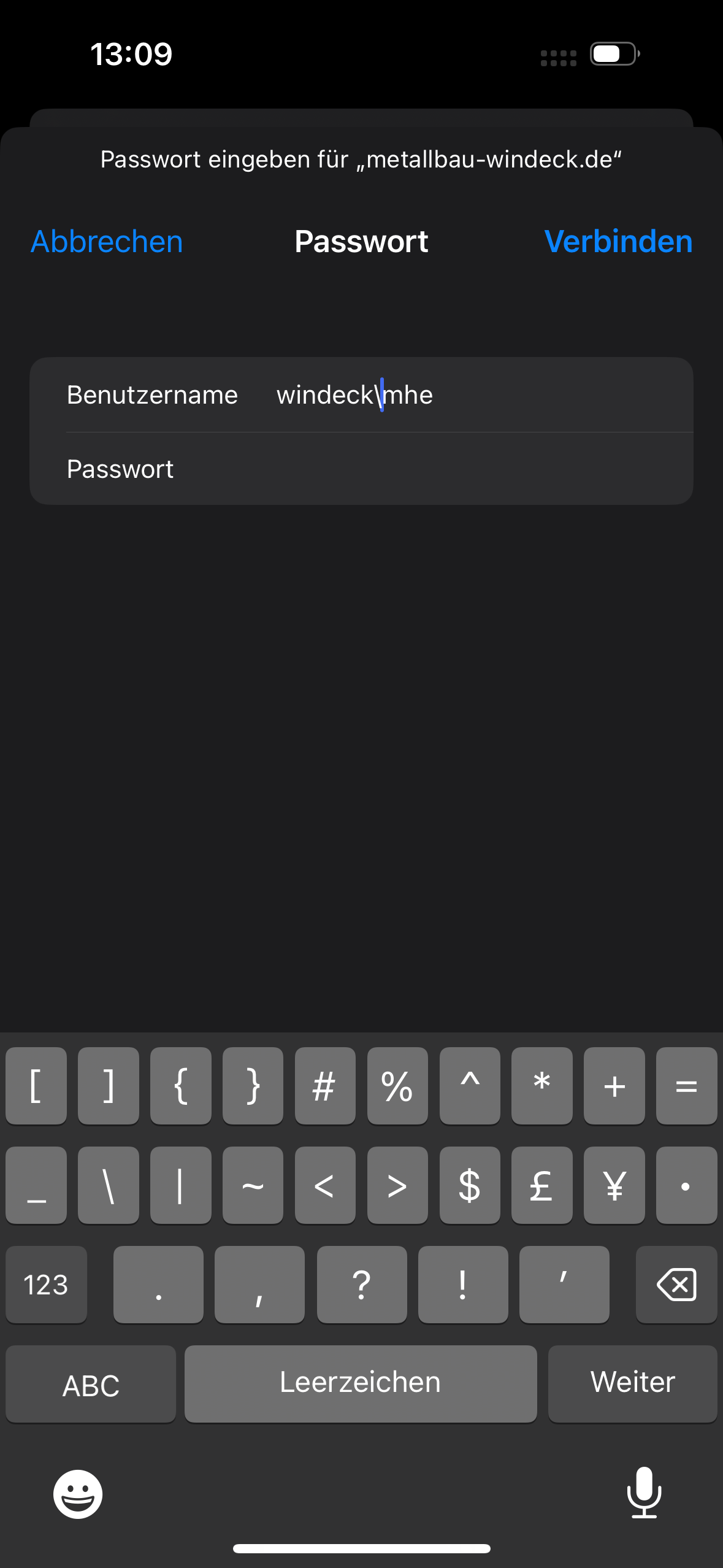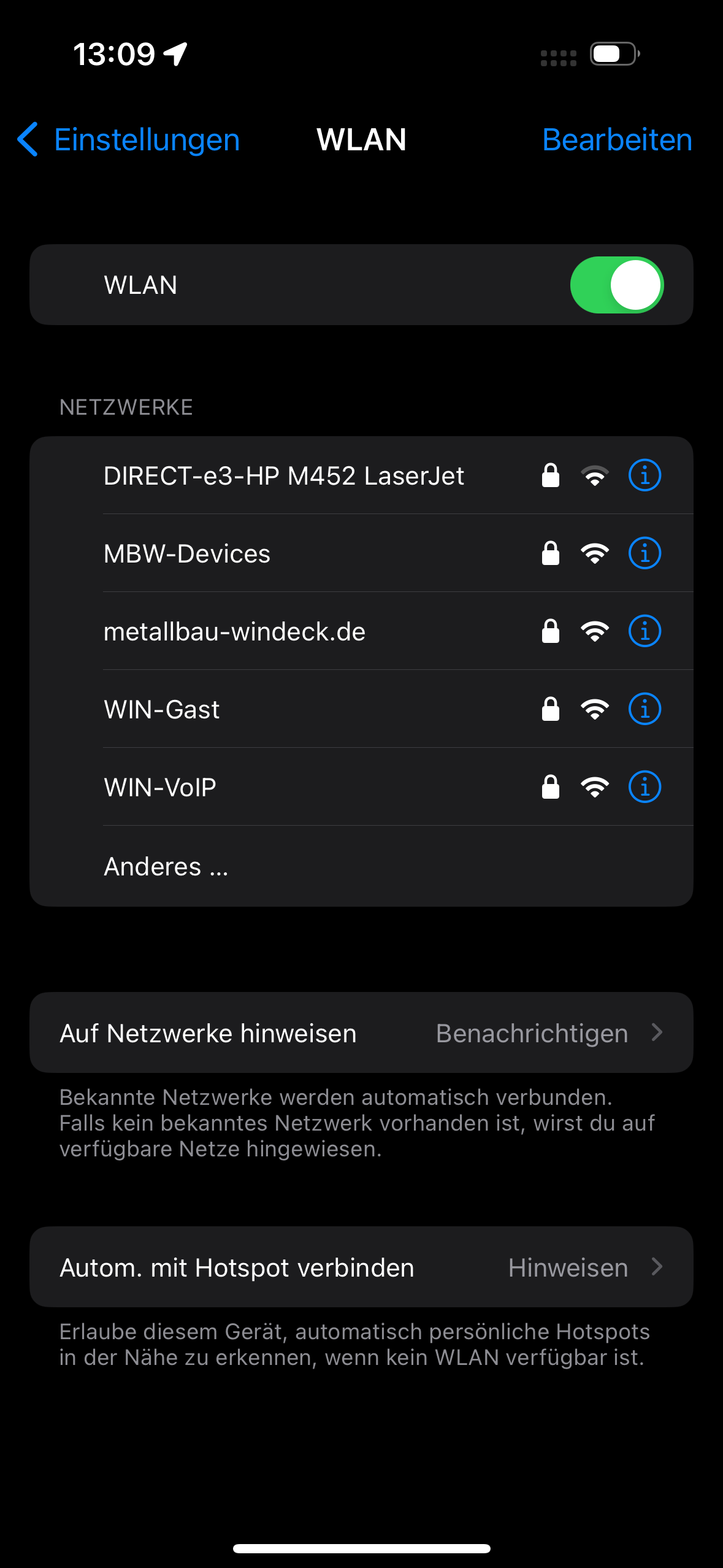 Danach wird die Verbindung erneut eingerichtet, indem aus der Liste das WLAN metallbau-windeck.de angetippt wird: