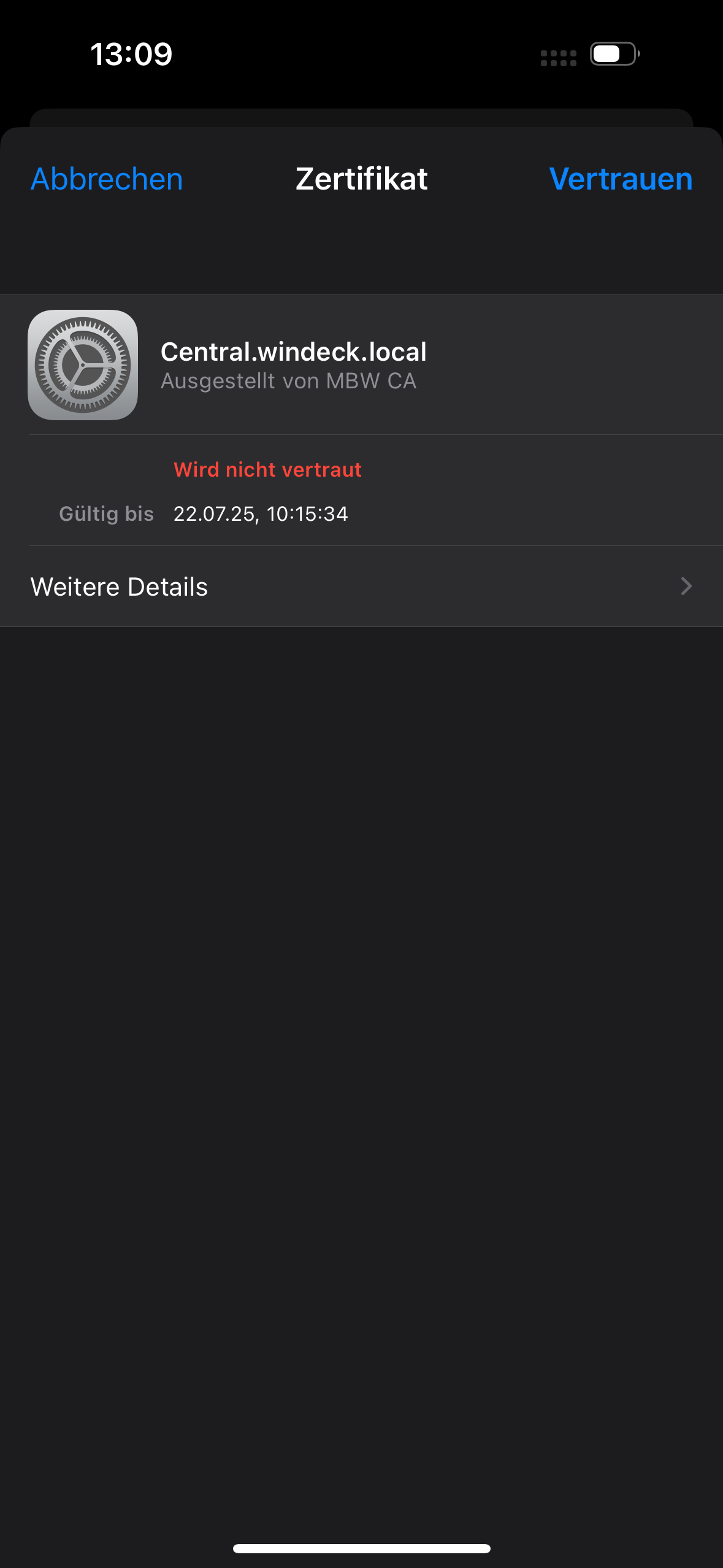 An einem Mobiltelefon oder Laptop erscheint eine (Fehler-)meldung, dass das Zertifikat für "metallbau-windeck.de" bestätigt werden soll. Trotz bestätigen der Meldung erscheint die Meldung später erneut. Folgender Weg ist derjenige der Wahl (hier speziell iPhone / iPad):